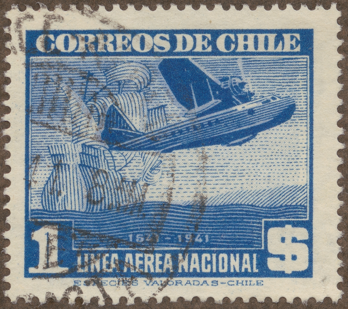 Frimärke från Chile, 1941. Motiv av Gammal Karavell: 1541. Passagerarmonoplan: 1941.