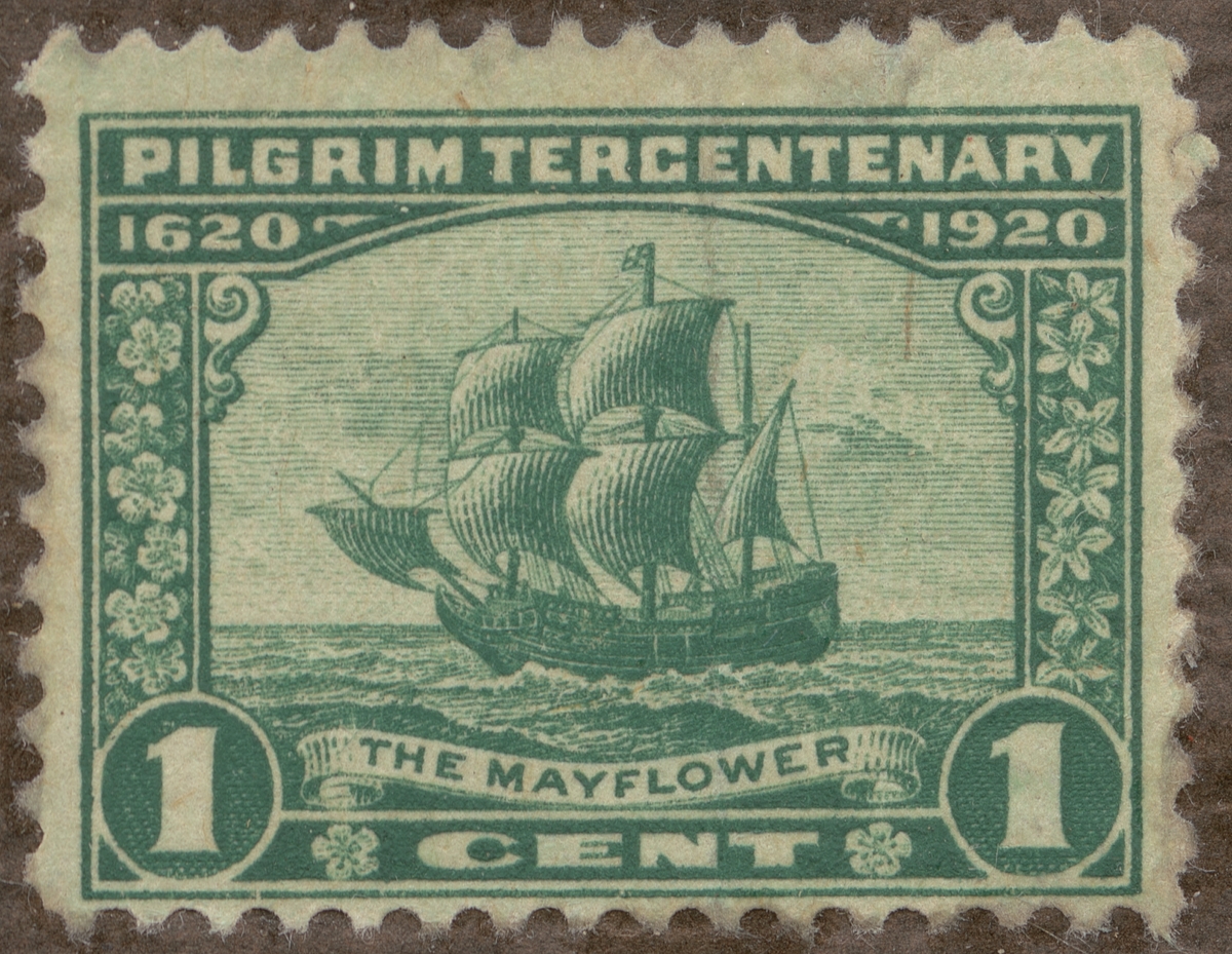 Frimärke från U.S.A., 1920. Motiv av Emigrant segelfartyget "The Mayflower" 300-årsminne av de engelska Puritaners (Pilgrim Fathers) landstigning i Provincetown och Plymouth, Massachusetts. 1620-1920.