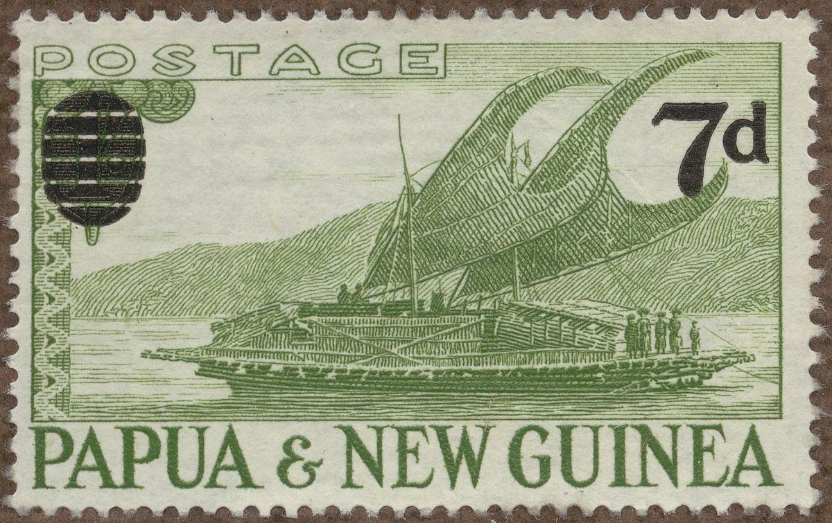 Frimärke från Papua och Nya Guinea, 1952. Motiv av Papuansk båt med säreget segel -s.k. "Lakatoi"- på Mambarafloden.