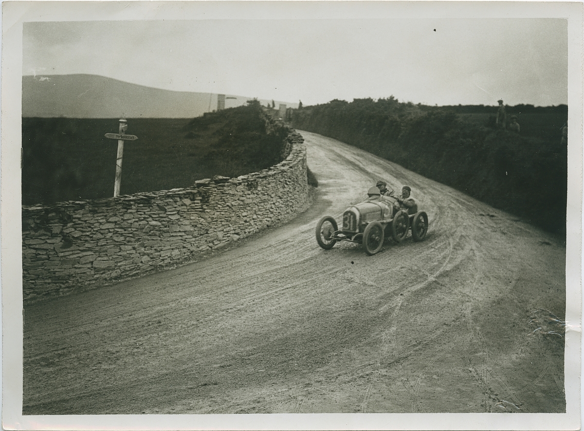 A. Divo i en Talbot Darracq rundar en trafikskylt i en kurva. International tourist trophy car races i Isle of Man.