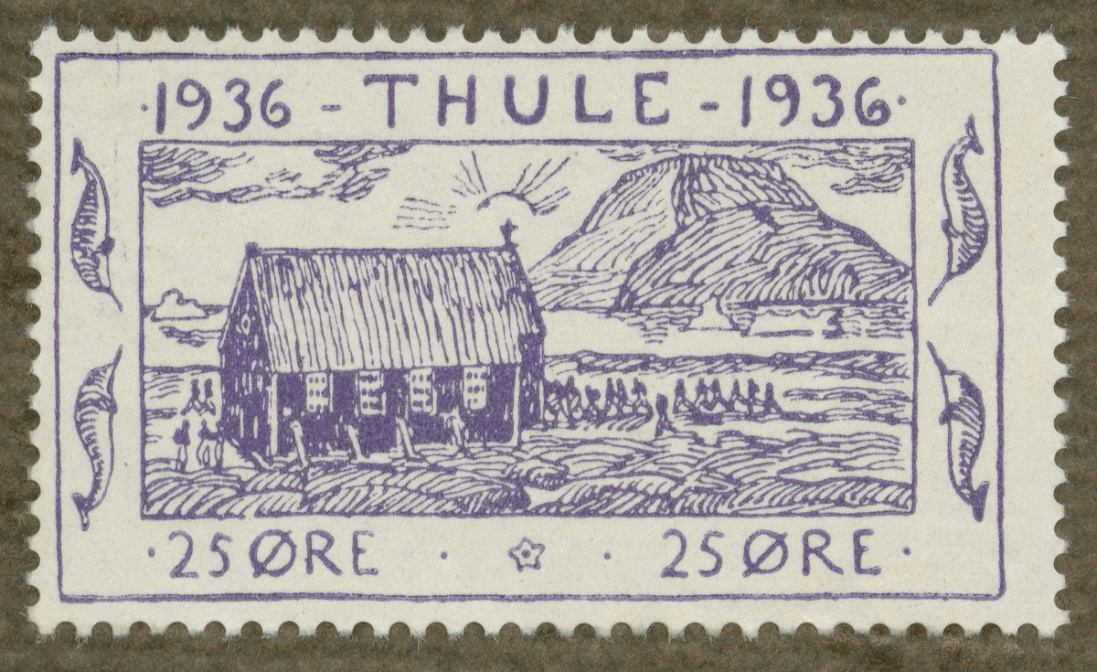 Frimärke från Thule, Nordvästra Grönland, 1936. Motiv av byggnad i Thule-kolonien.