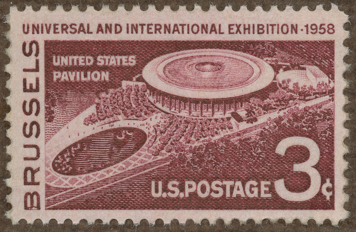 Frimärke från U.S.A., 1958. Motiv av U.S.A.-s paviljong Utställningen i Bryssel 1958.