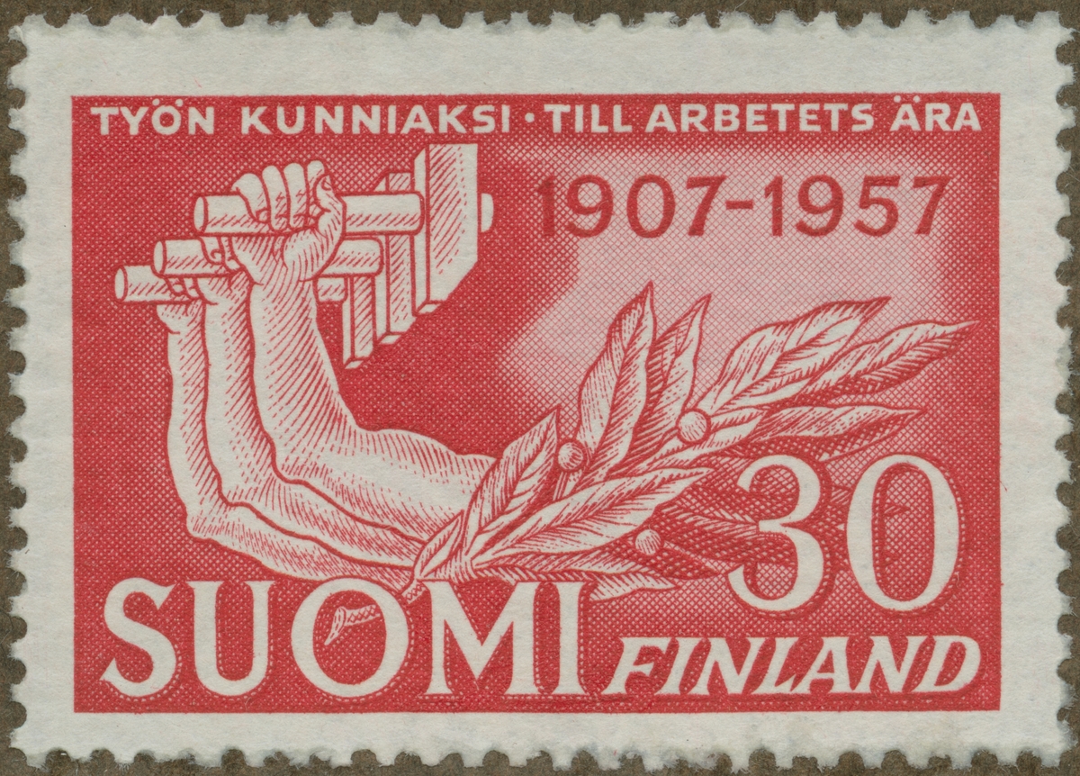Frimärke ur Gösta Bodmans filatelistiska motivsamling, påbörjad 1950. Frimärke från Finland, 1957. Motiv av händer med hammare. "Till arbetets ära - 50 år 1907-1957"