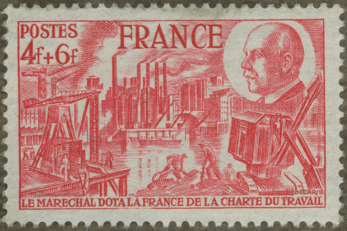 Frimärke ur Gösta Bodmans filatelistiska motivsamling, påbörjad 1950. Frimärke från Frankrike, 1944. Motiv av "Symbol för franskt industriarbete - Minne om Marsalk Henri Pétains 88-åriga födesledag - "
