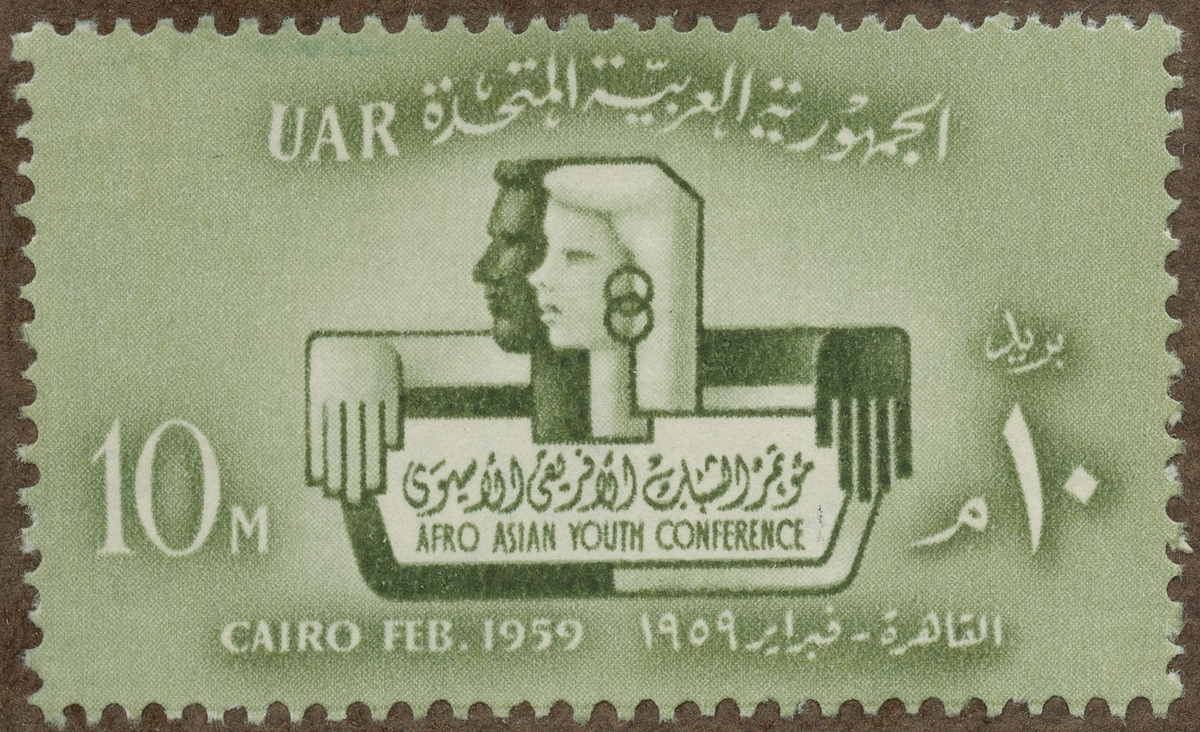 Frimärke från Fören. Arab. Republ., 1959. Motiv av Mans- och Kvinnohuvud Ungdomskonferens i Cairo februari 1959