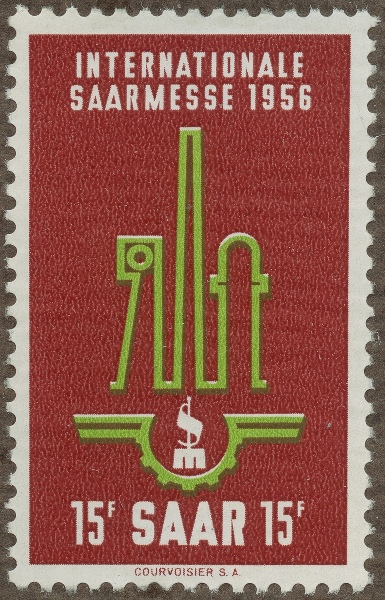 Frimärke från Saar, 1956. Motiv av Rörledning: symbol för Saar-industrien -Propaganda märke för Internationella Saar Mässan 1956-