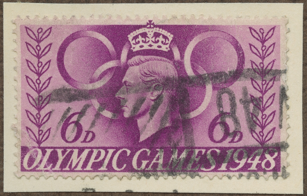 Frimärke från England, 1948. Motiv av de Olympiska 5 ringar 1948.