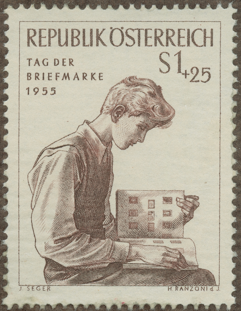 Frimärke från Österrike, 1955. Motiv av Filatelist med frimärksalbum Frimärkets Dag 1955