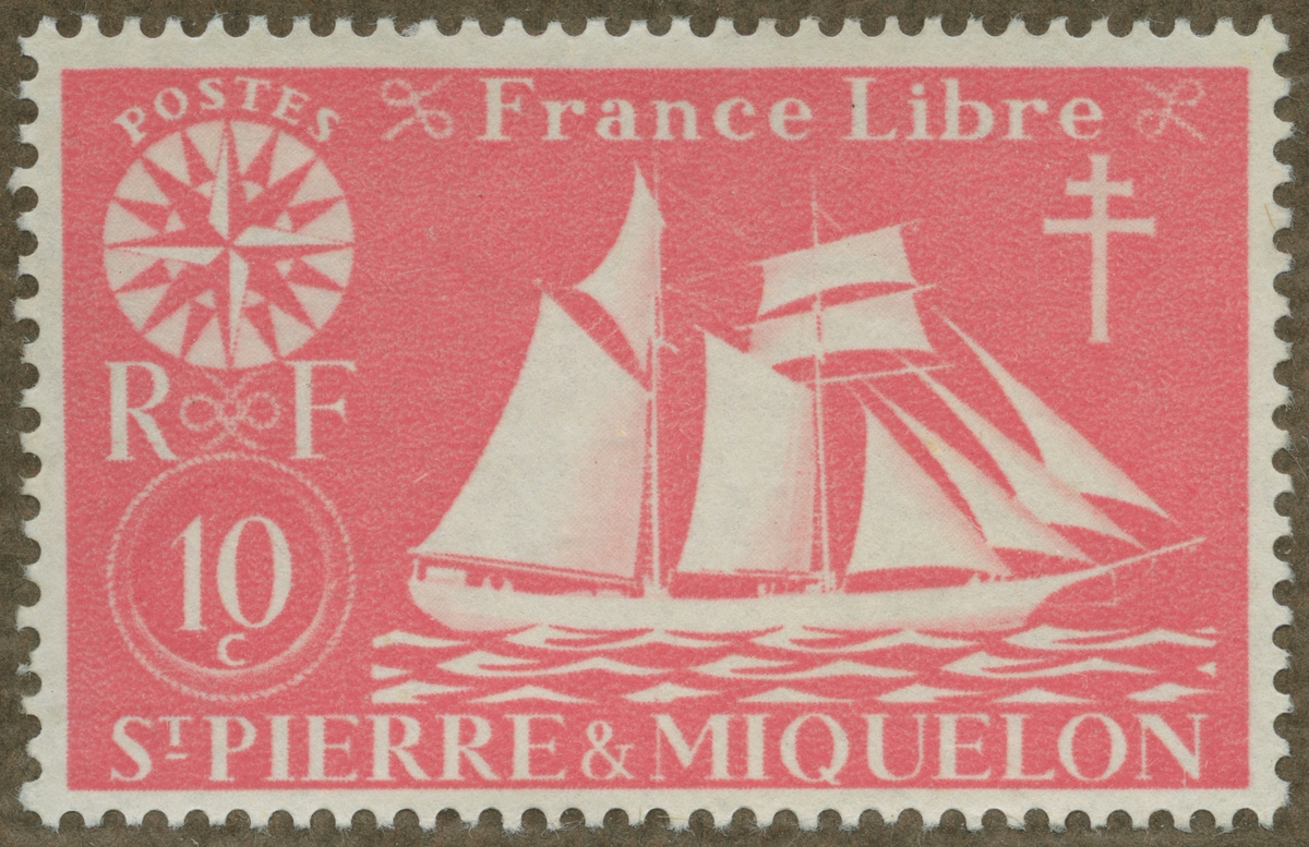 Frimärke ur Gösta Bodmans filatelistiska motivsamling, påbörjad 1950. Frimärke från S:t Pierre et Miquelon, 1942. Motiv av Kompassros. Segelbåt "Serie: F.N.F.L.=Forces Navales Françaises Libres = Fria Franska Sjöstridskrafter"