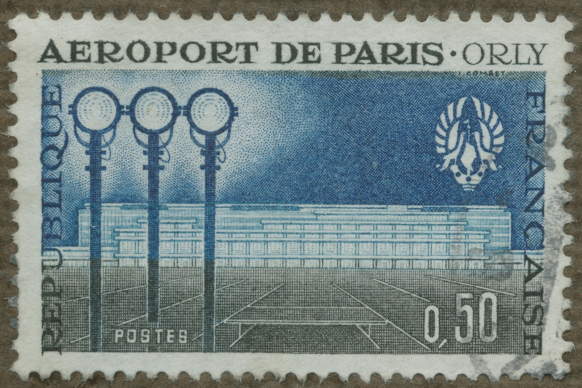 Frimärke från Frankrike, 1961. Motiv av flyghamnsbyggnaden på Orly flygplats utanför Paris.