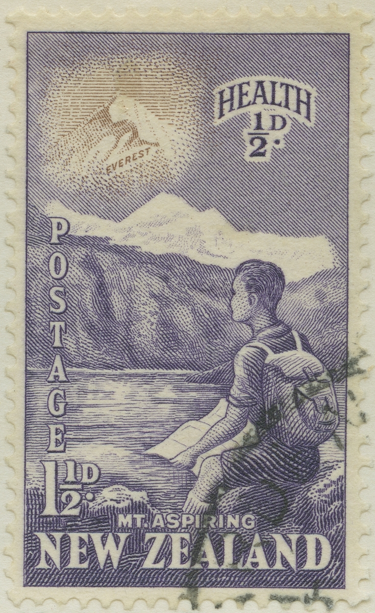 Frimärke ur Gösta Bodmans filatelistiska motivsamling, påbörjad 1950. Frimärke från New Zealand, 1954. Motiv av Snökedjan M:t Aspiring
