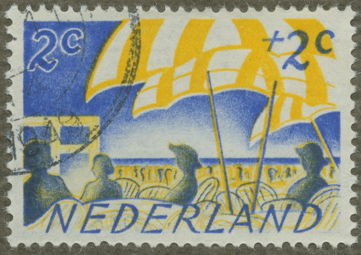Frimärke ur Gösta Bodmans filatelistiska motivsamling, påbörjad 1950. Frimärke från Nederländerna, 1949. Motiv av Strandbadliv "Serie till fördel för kulturella ändamål."