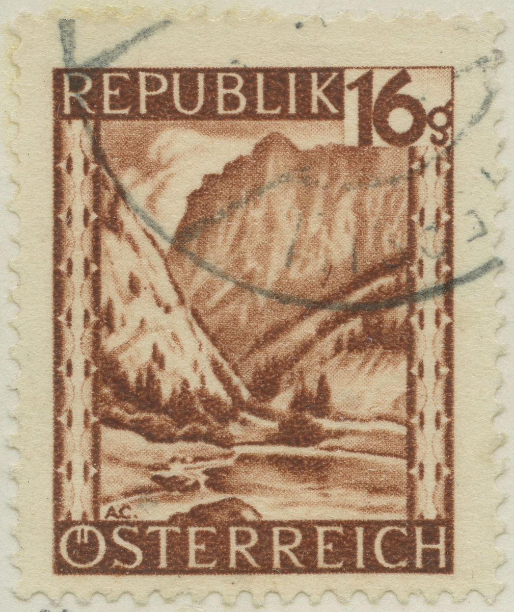 Frimärke ur Gösta Bodmans filatelistiska motivsamling, påbörjad 1950. Frimärke från Österrike, 1945. Motiv av Gesäuse Sjön,
