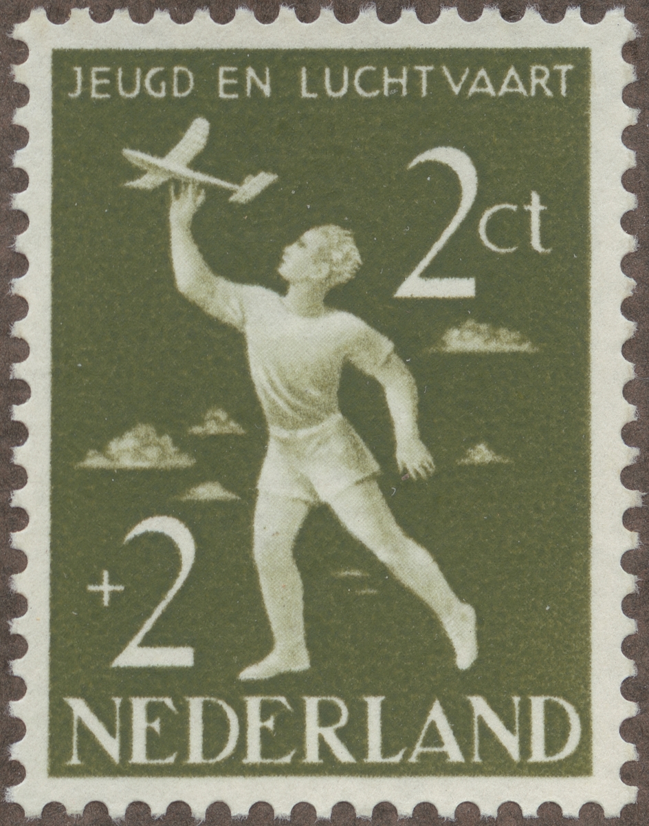 Frimärke från Nederländerna, 1954. Motiv av Yngling med modellflygmaskin "Serie till förmån för "Nederländska Flygfart Fonden""