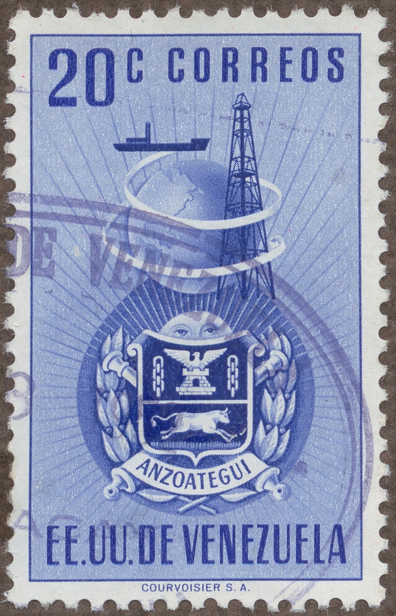 Frimärke från Venezuela, 1951. Motiv av petroleumborrtorn samt vapnet för Anzoategui.