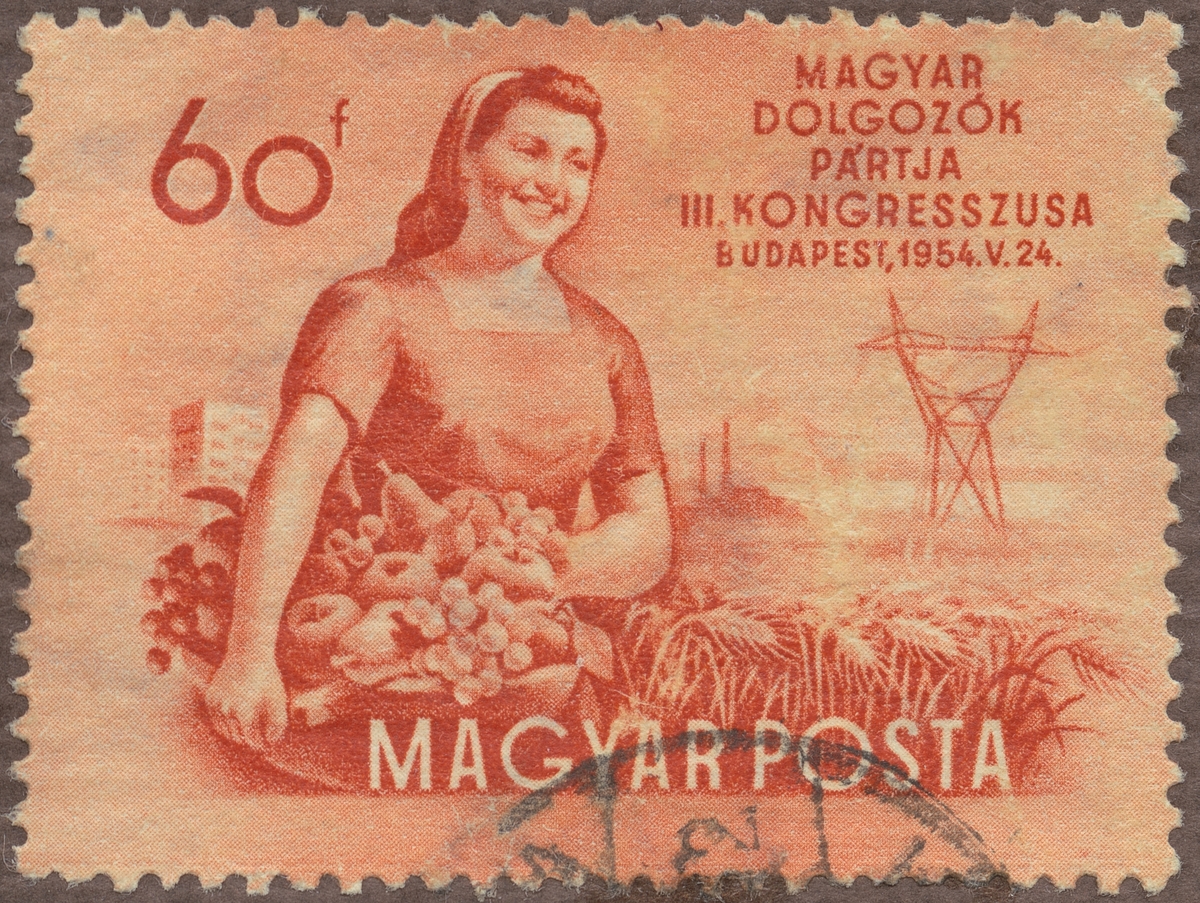 Frimärke från Ungern, 1954. Motiv av flicka med fruktskörd. "3-dje kongressen för agrikultur i Budapest 24.05.1954".