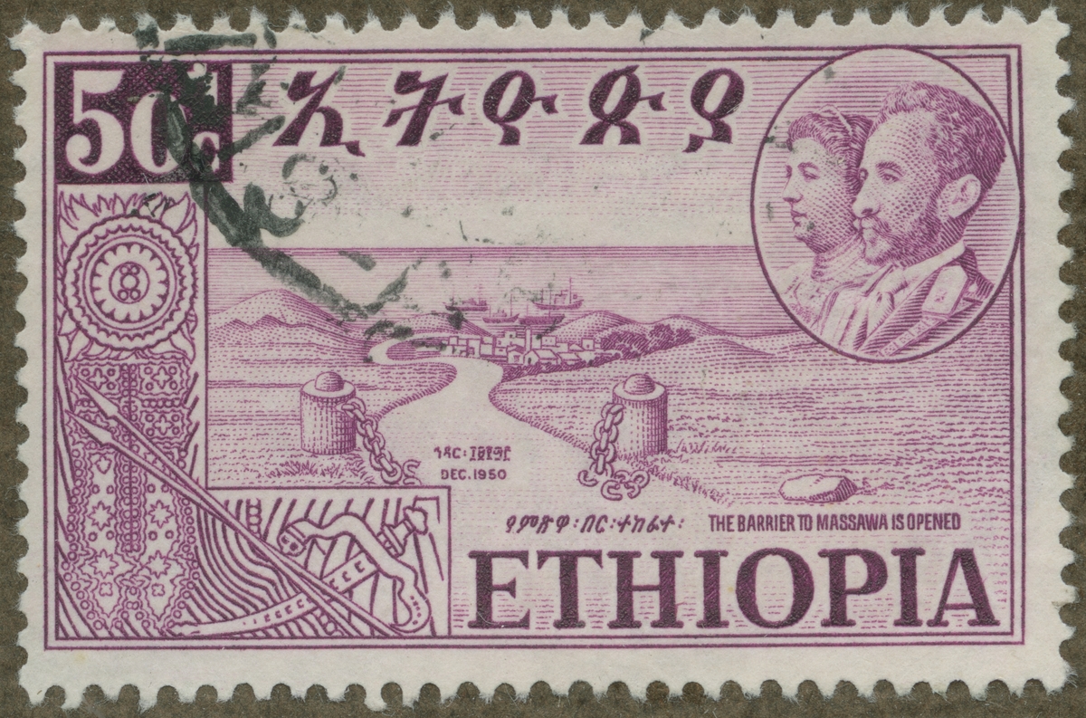 Frimärke från Etiopien, 1950. Motiv av Barrieren vid Massava Öppnad dec 1950