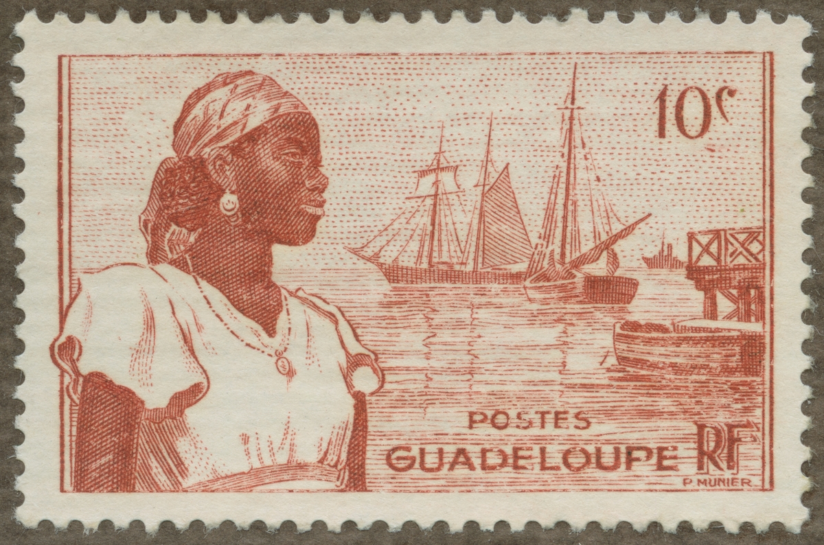 Frimärken från Guadeloupe, 1947. Motiv av Hamnen i Basse Terre Guadeloupe