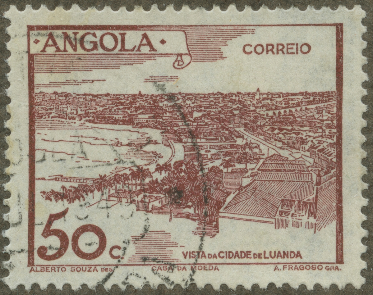 Frimärke från Angola, 1949. Motiv av Hamnen i Staden Luanda i Angola