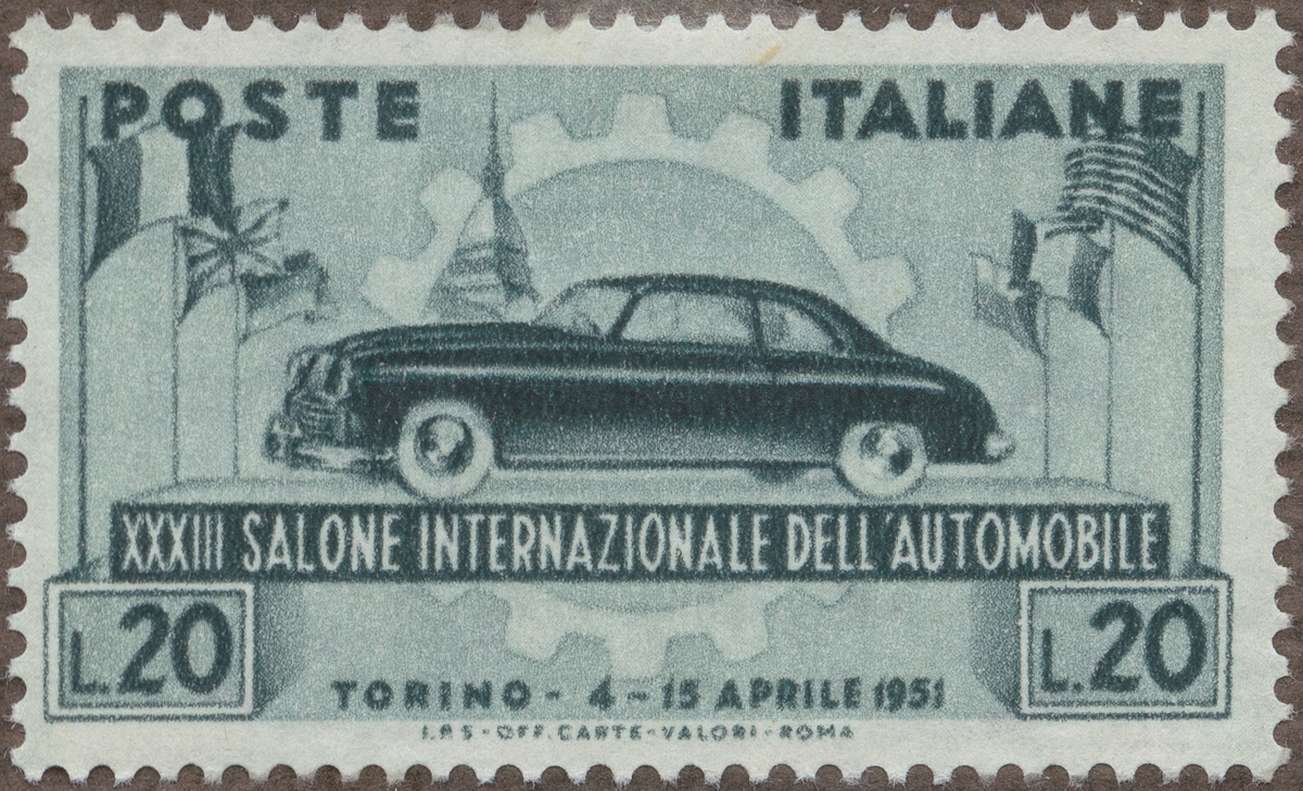 Frimärken ur Gösta Bodmans filatelistiska motivsamling, påbörjad 1950. Frimärke från Italien, 1951. Motiv av Bil mot fonden av ett kugghjul "33-dje internationella bil utställningen i Turin"
