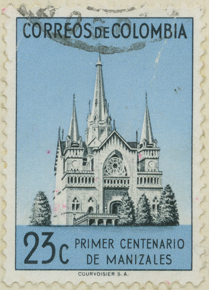 Frimärke från Colombia, 1952. Motiv av kyrkan i Manizales. "Staden Manizales 100 år: 1852-1952".