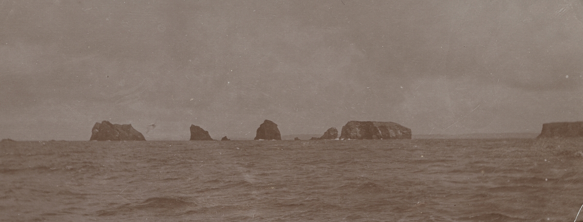 Fotografi från första svenska Antarktisexpeditionen 1901-1904. Vy över vågigt hav, klippor och himmel.
