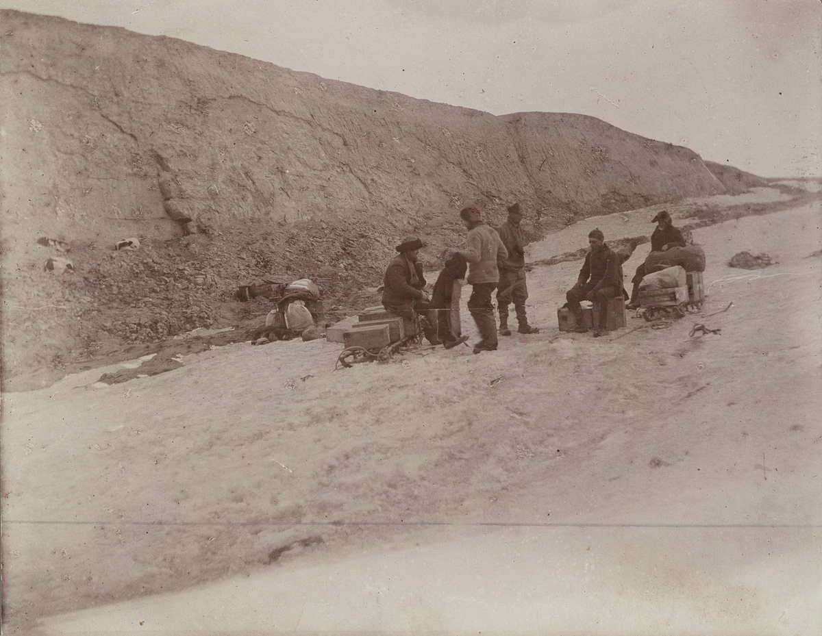 Fotografi från första svenska Antarktisexpeditionen 1901-1904. Expeditionsdeltagare förbereder sig på att gå ombord på fartyget Uruguay.