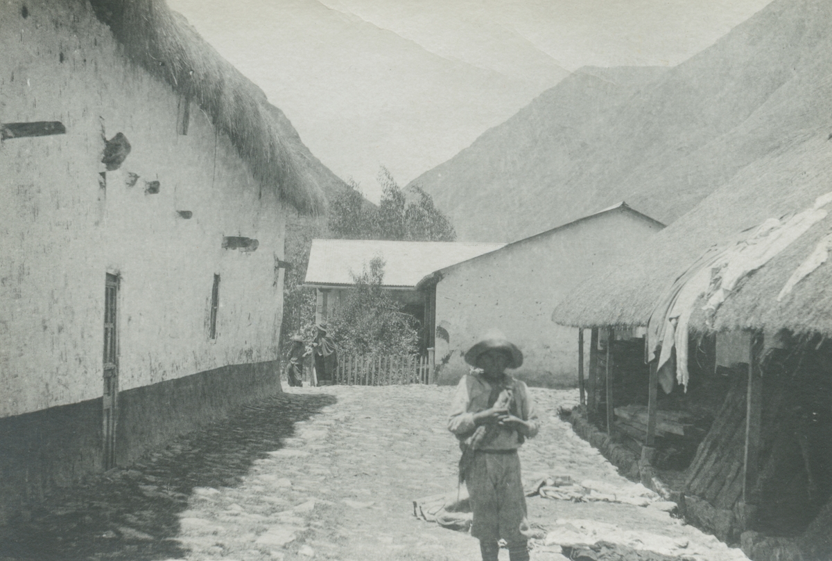 Fotografi från expedition till Peru 1920. Motiv av en pojke som står på en liten gata i en bergsby.