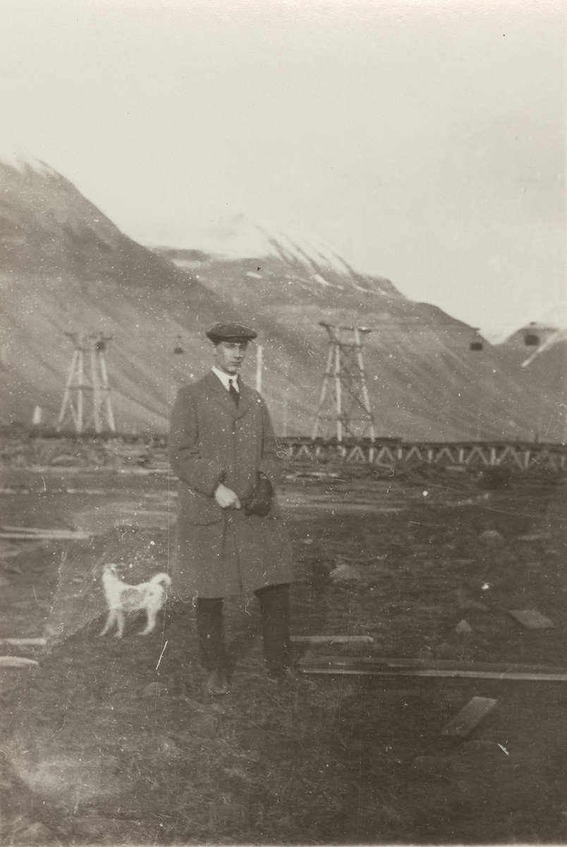 Fotografi från expedition till Spetsbergen. Motiv av man med hund som poserar vid Sveagruvan.