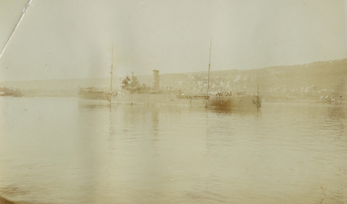 Fotografi från expedition till Spetsbergen. Motiv av stort fartyg i havet nedanför berg.