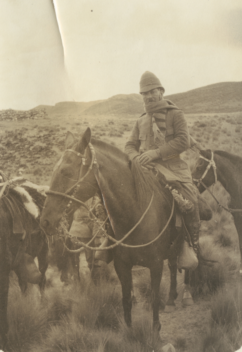 Fotografi från kuvert märkt med "Ernst Nordenskjöld". Motiv av expeditionsdeltagare som rider på häst.