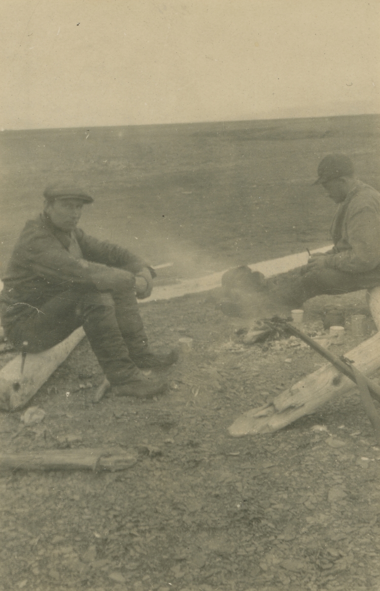 Spetsbergen övriga bilder. Motiv av två män som sitter vid lägereld, 1918-1919.
