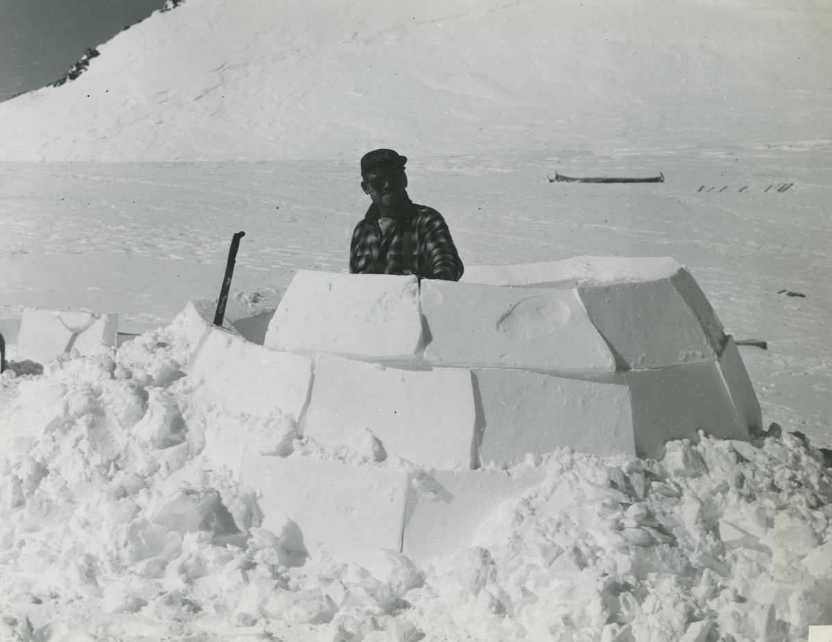 Fotografi från låda märkt Bernt Balchen. Balchen var norsk-amerikansk flygare, polarforskare och militär. Motiv av expeditionsdeltagare som bygger en igloo i ett snölandskap.