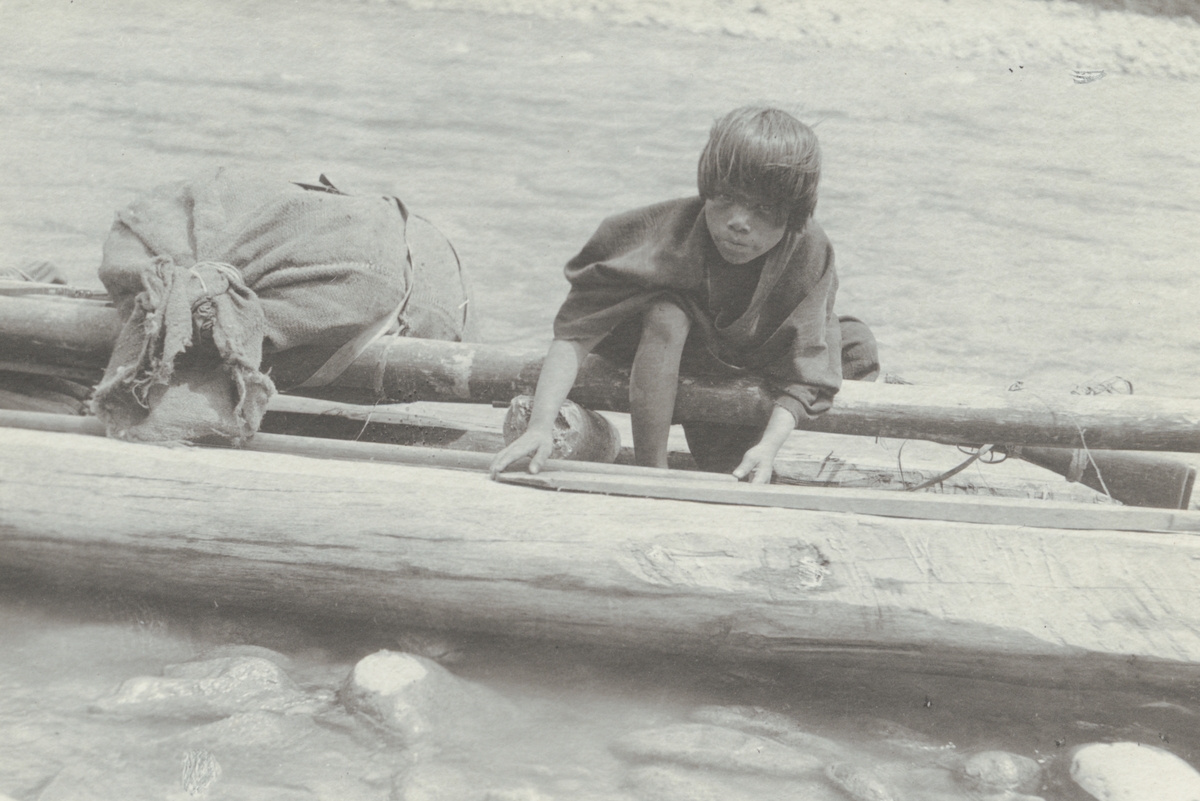 Fotografi från kuvert märkt med "Ernst Nordenskjöld". Motiv av pojke med kanot i vattendrag i djungeln.