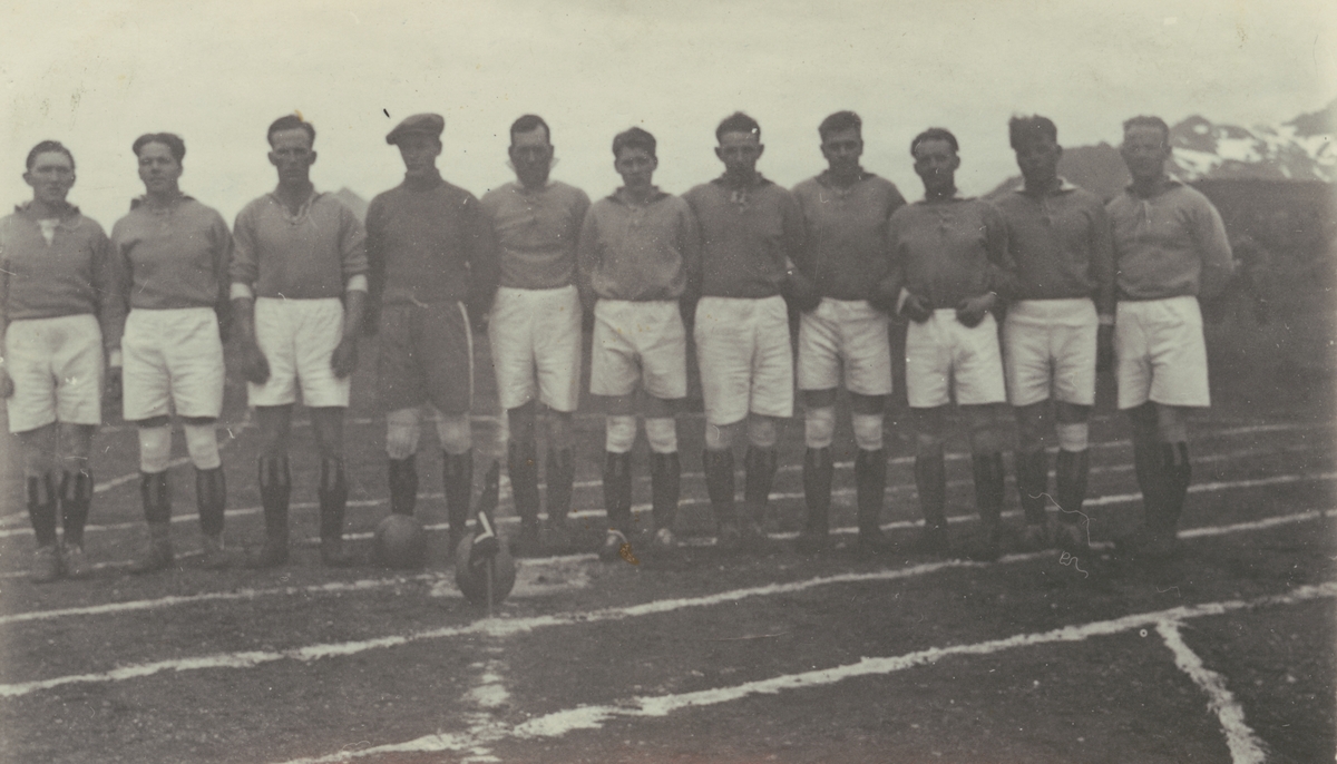 Bild från expedition i Antarktisområdet. Motiv av fotbollsspelare som står uppställda på rad.