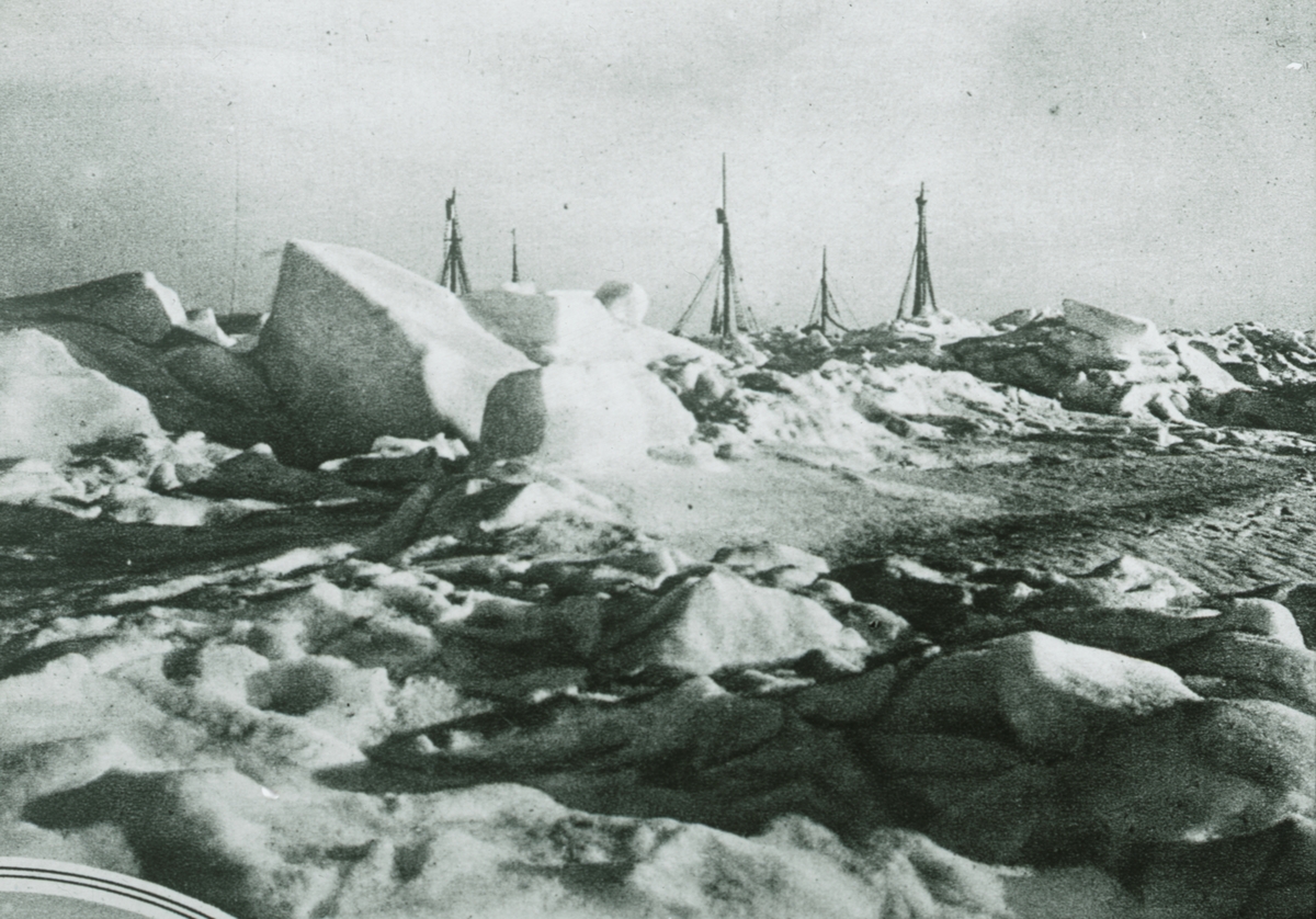 Fotografi från Grönland. Motiv av snölandskap med skeppsmaster i bakgrunden.