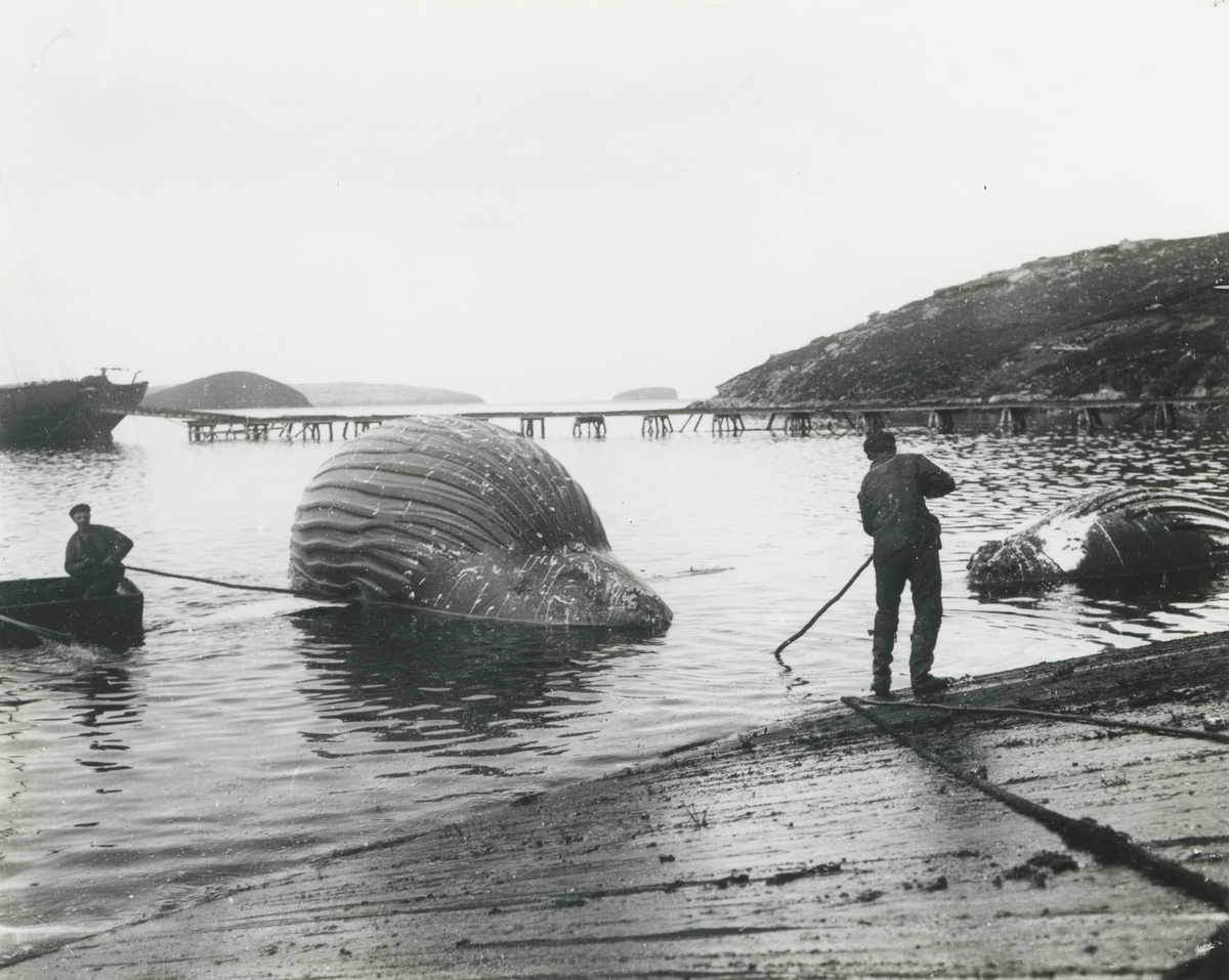 Bild från expedition i Antarktisområdet. Motiv av två män bredvid döda valar.