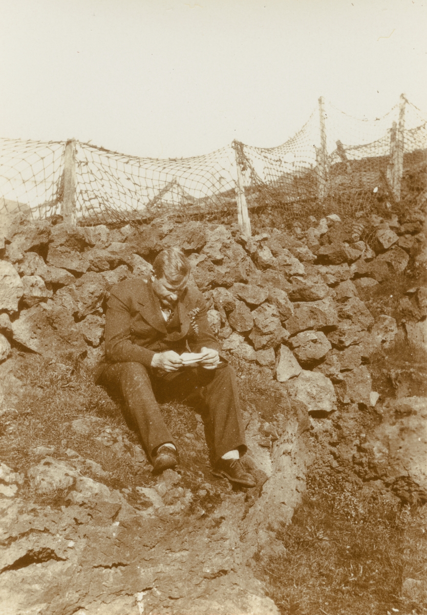 Fotografi från Albin Ahrenbergs resa till Grönland 1929. Motiv av man som sitter och läser på stor sten.