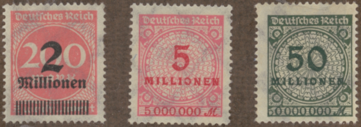 Frimärken från Tyskland, 1923. Motiv av Tyska valutainflationen II 2 millioner mark- 50 millioner mark.