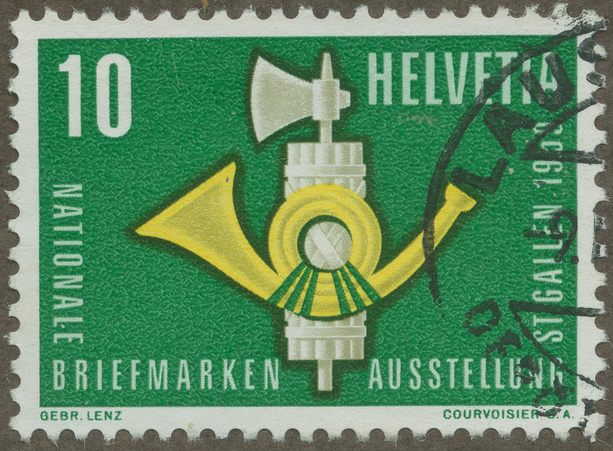 Frimärke från Schweiz, 1959. Motiv av Posthorn + diverse N A B A G Filatelistutställning i S:t Gallen 1959