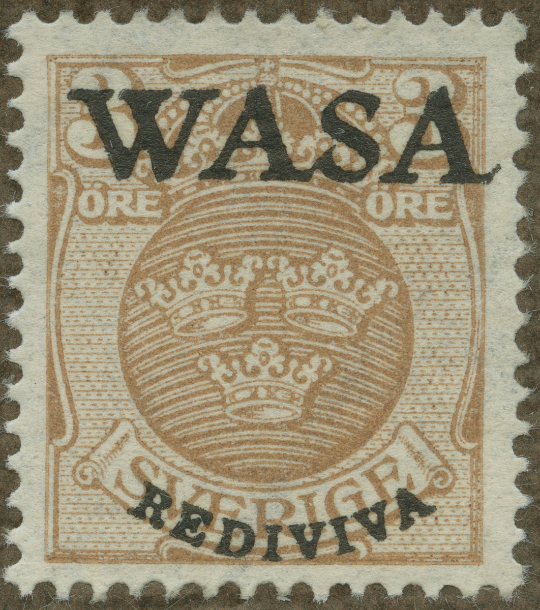 Frimärke från Sverige, 1963. Motiv av Påtryck på frimärke, typ "Lilla Riksvapnet" utg.1920. -Till förmån för regalskeppet "Wasa": ej giltigt för frankering.