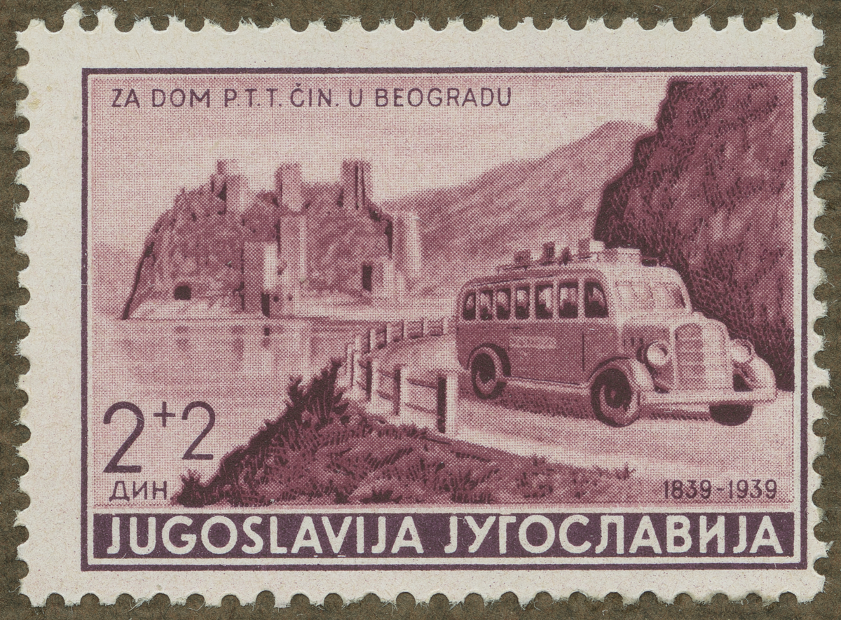 Frimärke från Jugoslavien, 1939. Motiv av Jugoslavisk Postbuss Posten 100 år 1839-1939.