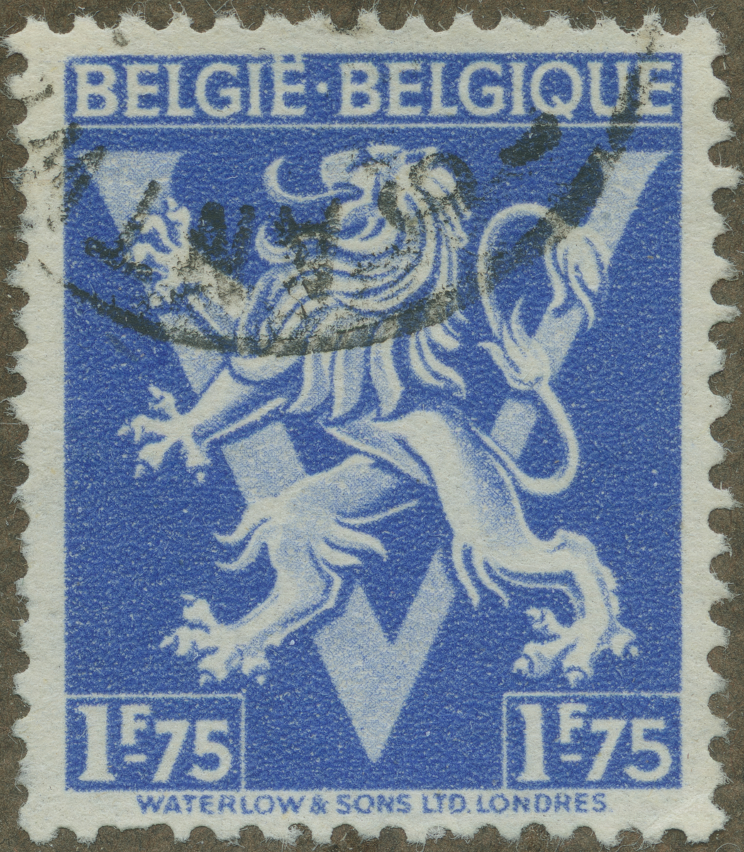 Frimärke från Belgien, 1945. Motiv av Belgiens Vapen-lejon mot bakgrund av "V"-märke seger-symbol. -Minne av segern: världskrig II-