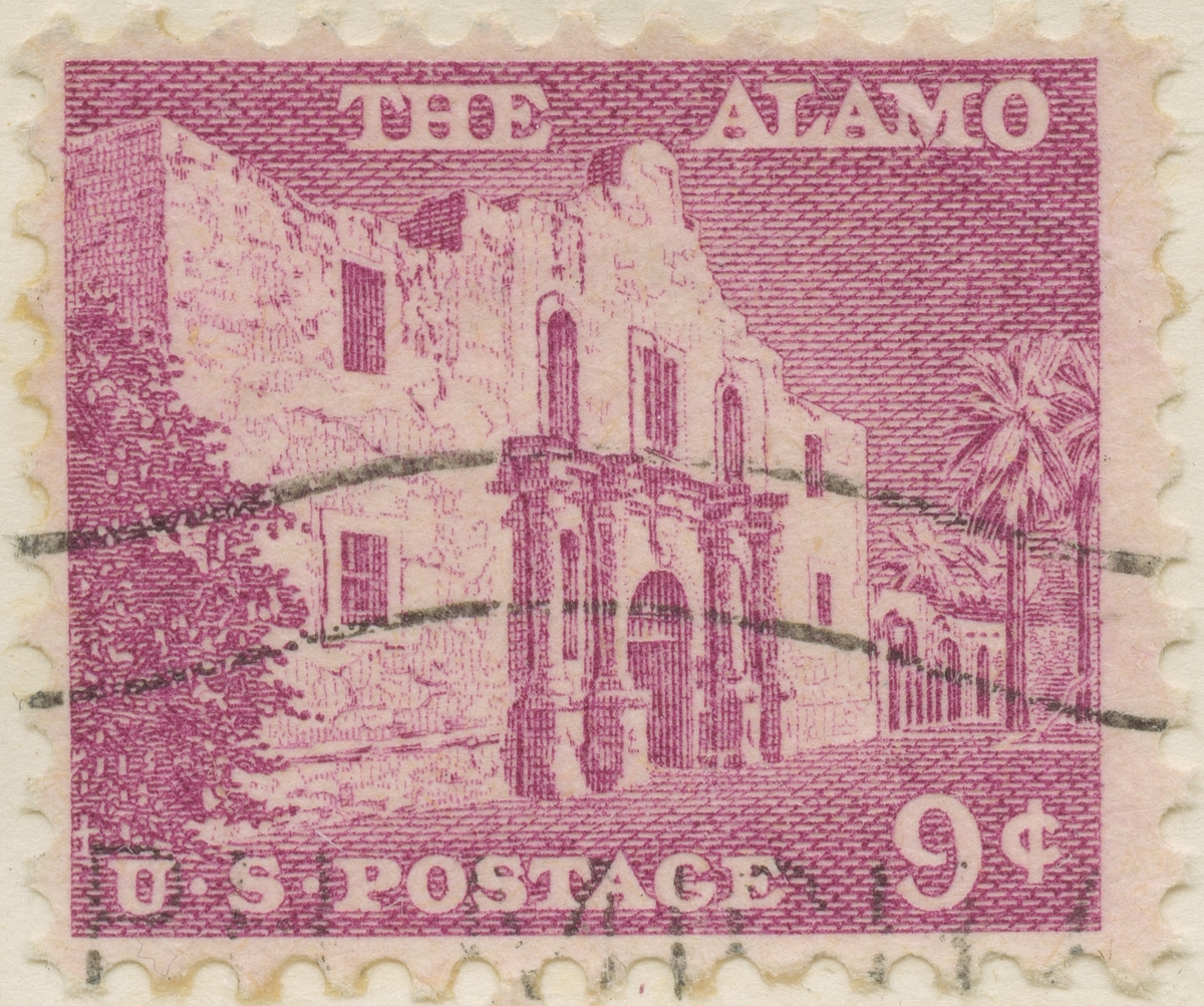 Frimärke från U.S.A., 1956. Motiv av Ruinrester av "Alamo Mission" i San Antonio, Texas. Ursprungligen kyrka, blev byggnaden fort under Texas´ frigörelse från Mexico 1836 under ledning av amerikanska generalen Sam Houston. "Serie: Historiska motiv."