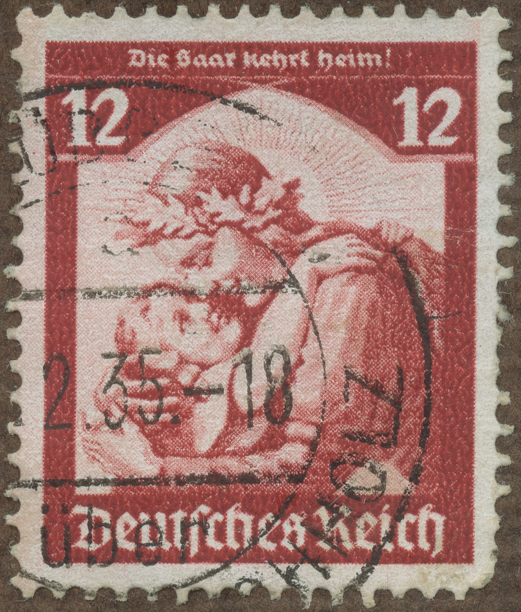 Frimärke från Tyskland, 1935. Motiv av Moder och barn Symbol för Saars återfören. med Tyskland