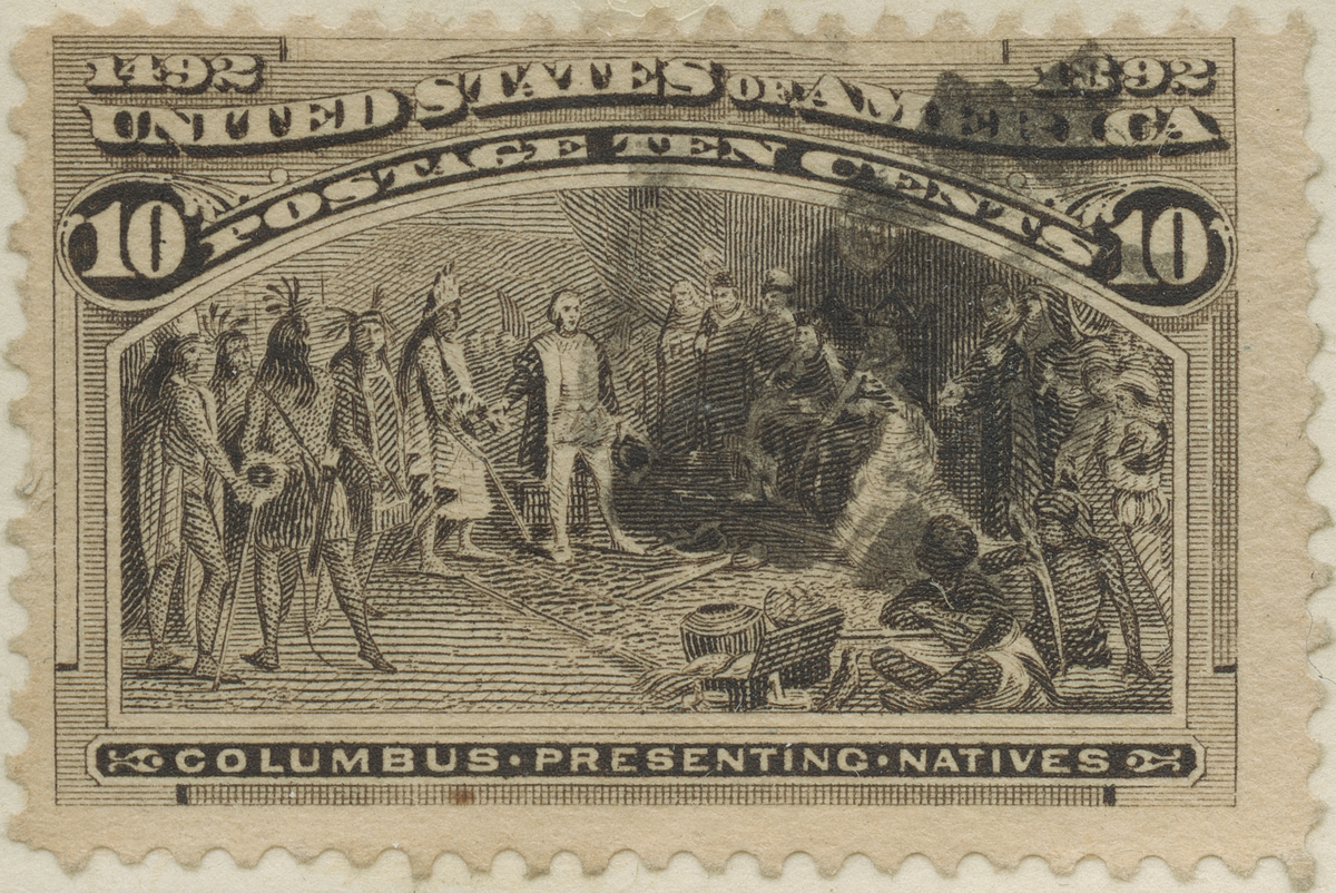 Frimärke från U.S.A., 1893. Motiv av Christopher Columbus framvisar de första av amerikansk ursprungsbefolkning i Europa