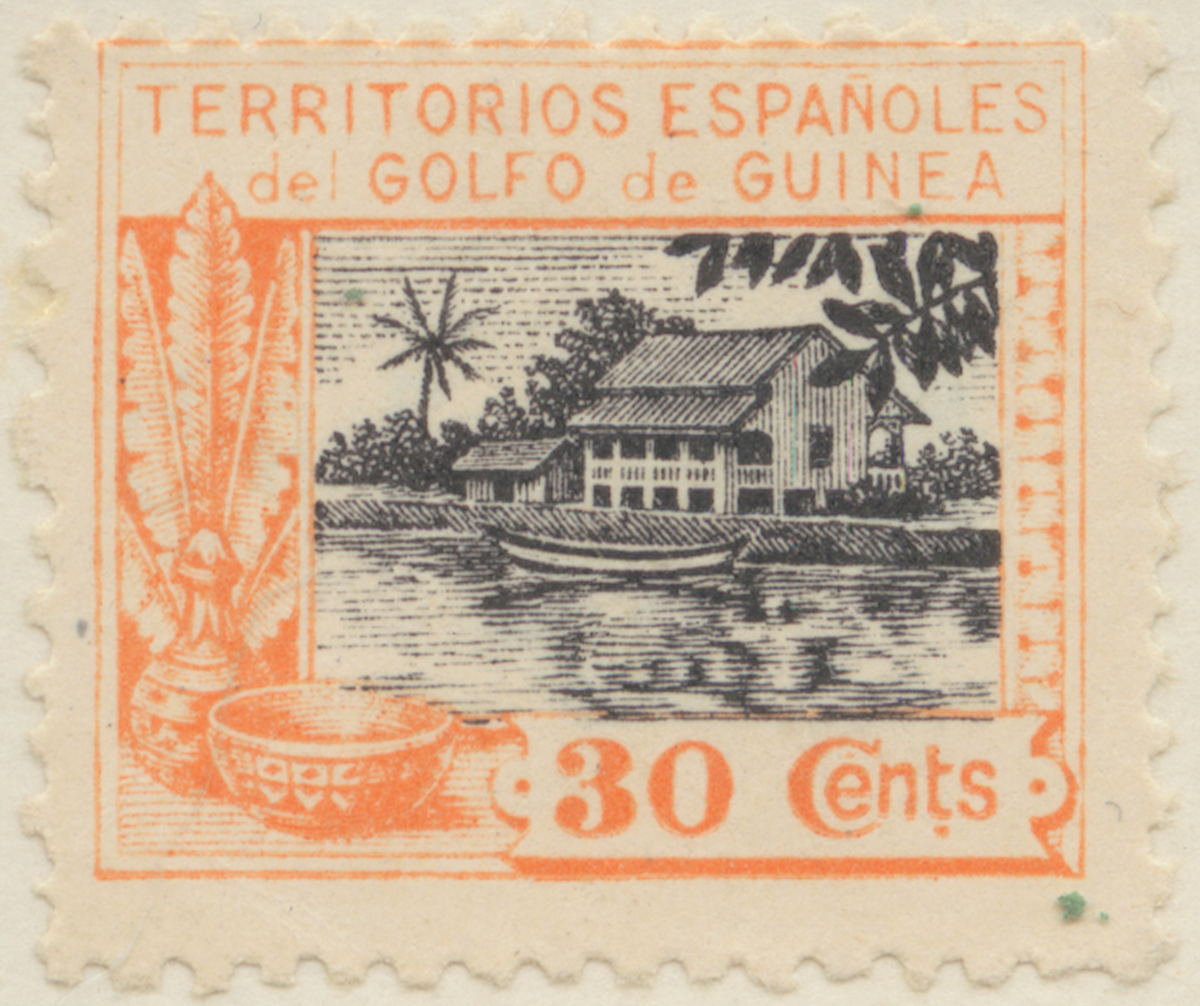 Frimärke från Spanska Guinea, 1924. Motiv av Guvenörsbyggnaden på Santa Isabel