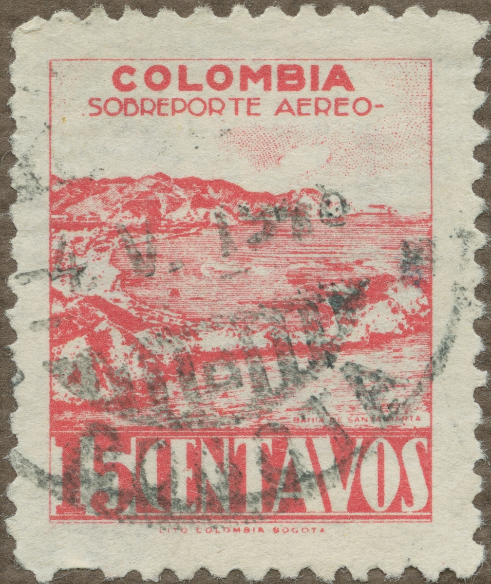 Frimärke ur Gösta Bodmans filatelistiska motivsamling, påbörjad 1950. Frimärke från Colombia, 1945. Motiv av Santa Marta bukten i Colombia