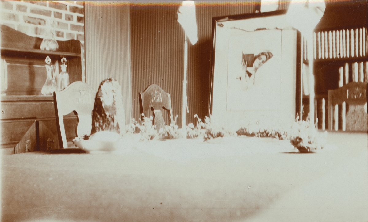 Fotografi från expedition till Spetsbergen. Motiv av findukat matbord. På änden av bordet står en tavla med motiv av en kvinna.