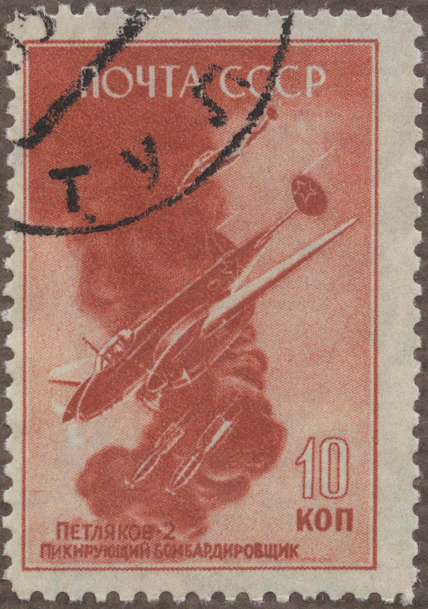 Frimärke från Ryssland, 1945. Motiv av Störtdykande monoplan "-Serien: Luftkrig-